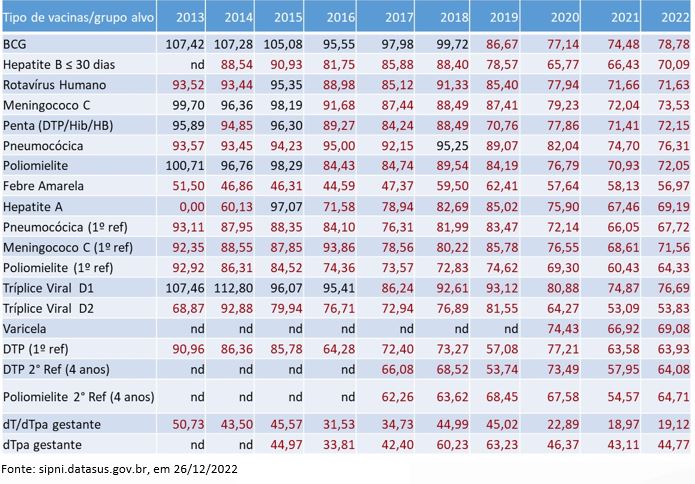 O quadro abaixo, cuja fonte são os dados do próprio Programa Nacional de Imunizações (DataSus) do Governo Federal, demonstra claramente a queda nos índices de vacinação no Brasil de 2013 até 2022, com índices chegando, em determinadas imunizações, a 30% de queda na cobertura vacinal. A mensagem que o Movimento Nacional pela Vacinação está tentando disseminar para reverter esta queda nos índices de adesão aos imunizantes é simples e direta: “Vacina é vida, vacina é para todos”.