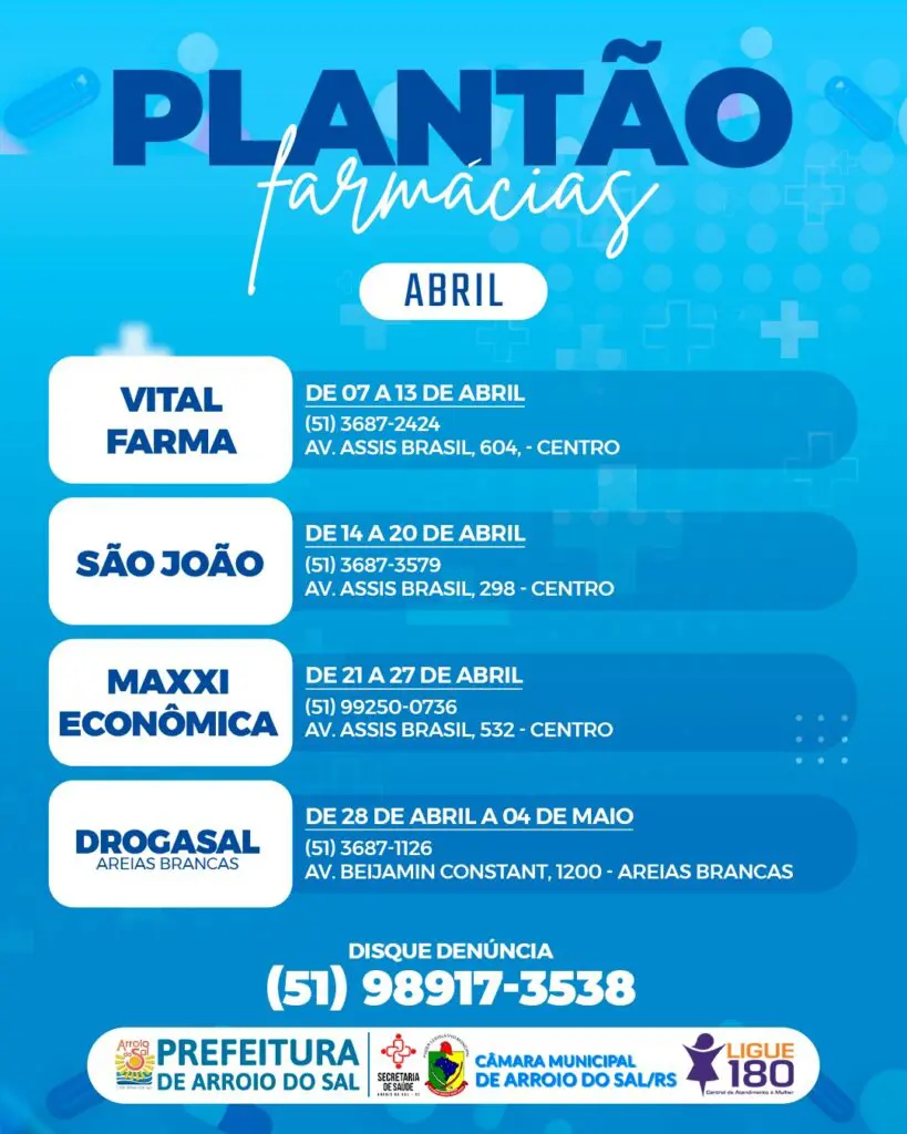 As farmácias que farão parte do rodízio são: Vital Farma (Centro), São João (Centro), Maxxi Econômica (Centro) e Drogasal (Areias Brancas). Caso algum cidadão constate alguma irregularidade no serviço de plantão, pode denunciar pelo Disque Denúncia: 51 98917 3538.