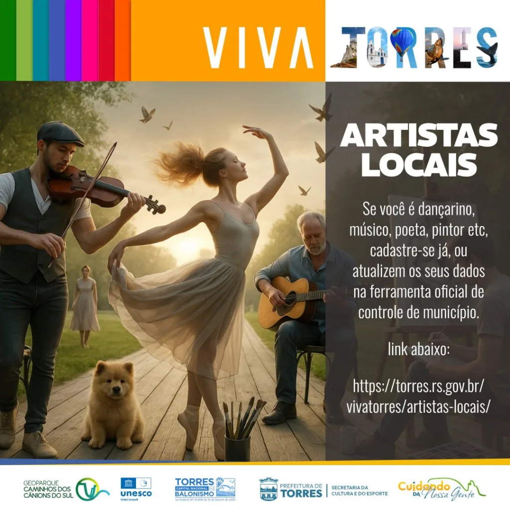 A Prefeitura de Torres convoca todos os artistas locais, incluindo dançarinos, músicos, poetas, pintores e demais profissionais da cultura, para realizarem ou atualizarem seus cadastros na plataforma oficial do município. De acordo com a administração municipal, o registro é essencial para mapear e fortalecer o setor cultural, garantindo maior visibilidade e acesso a oportunidades.