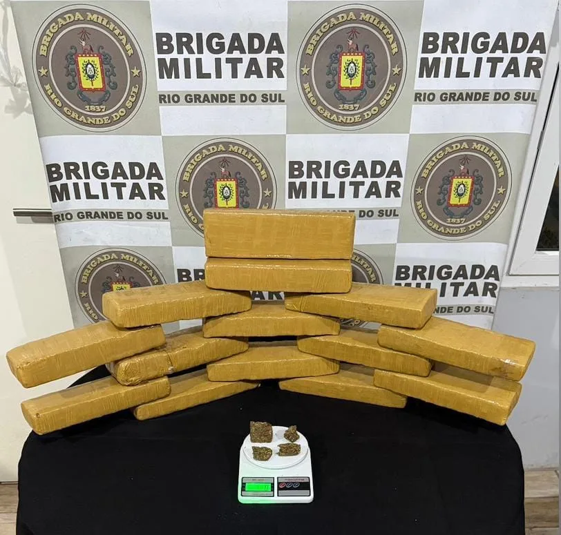 Na abordagem, os policiais encontraram 14 tijolos de maconha, totalizando 14,65 quilos, uma balança de precisão e um celular. O forte odor da substância no porta-malas foi um indicativo decisivo para a confirmação do flagrante.
