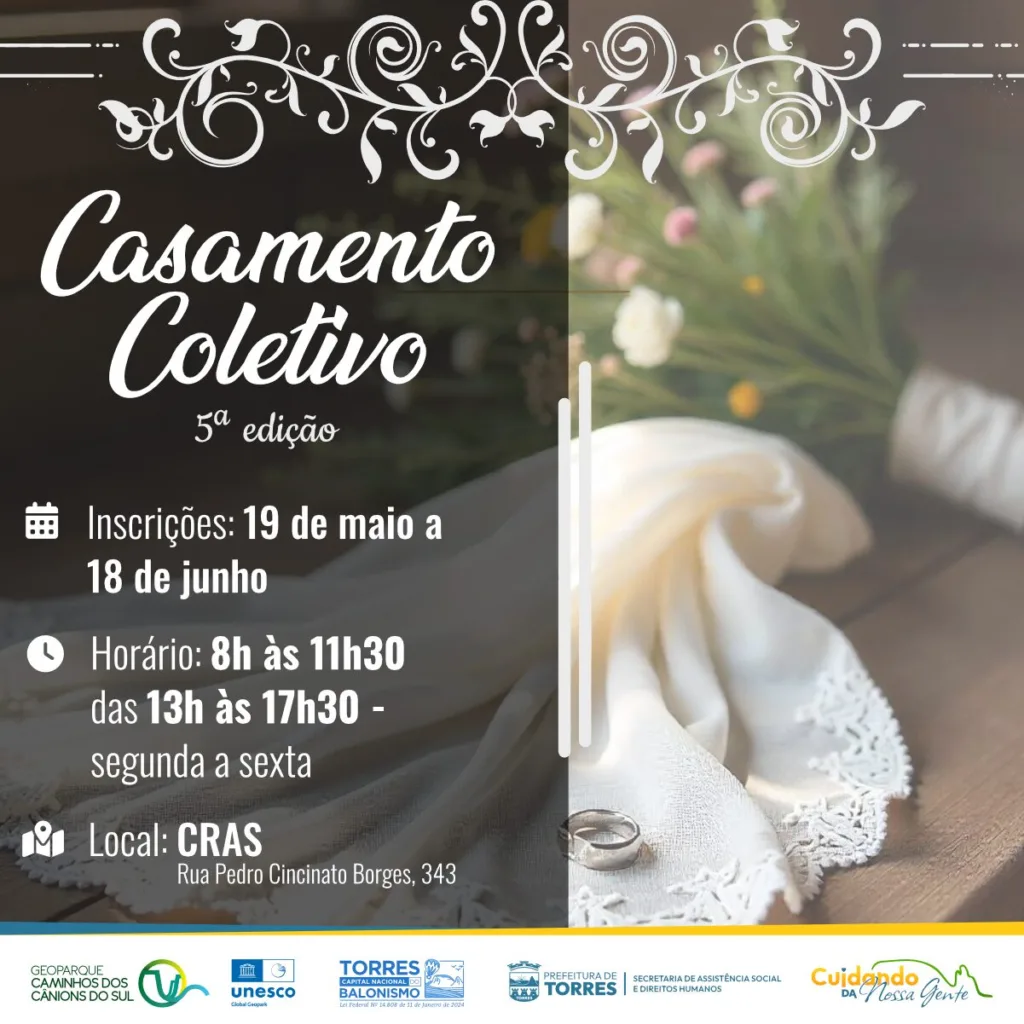 A 5ª edição do Casamento Coletivo em Torres está com inscrições abertas para casais que sonham em oficializar sua união, mas enfrentam dificuldades financeiras. A ação, promovida pela Prefeitura do município, visa oferecer a oportunidade de realizar o casamento civil de forma gratuita, atendendo principalmente aqueles em situação de vulnerabilidade social. Para participar, os interessados devem atender a alguns requisitos, como ser residente de Torres, estar inscrito no Cadastro Único e não possuir veículos registrados em seus nomes.