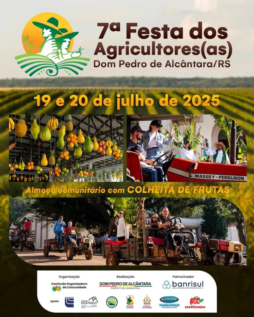 Nos dias 19 e 20 de julho de 2025, Dom Pedro de Alcântara se transforma no palco da 7ª edição da Festa dos Agricultores, um evento que já é tradição e que reúne toda a comunidade para celebrar aqueles que trabalham, com dedicação e amor, para garantir o alimento em nossas mesas.