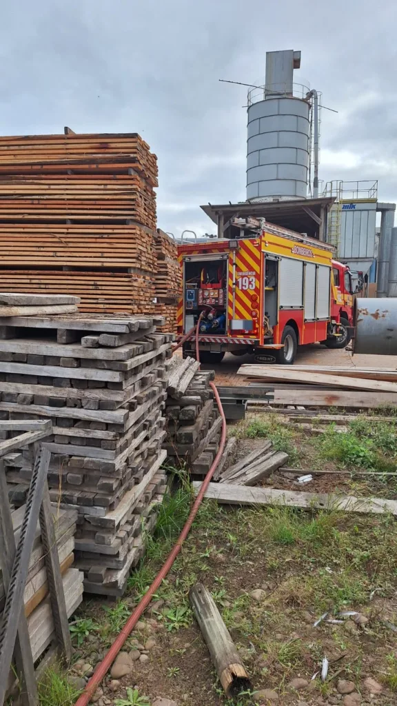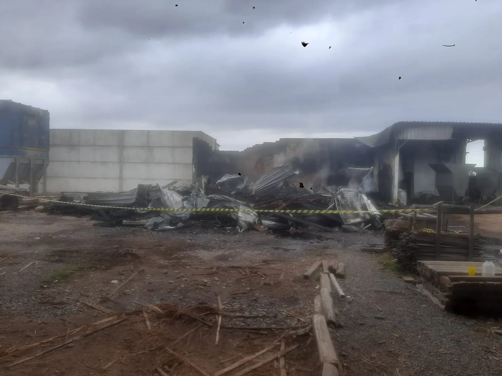 Fogo começou ao lado de pavilhão industrial e consumiu estrutura de 100 m² com 80 m³ de madeira em secagem.