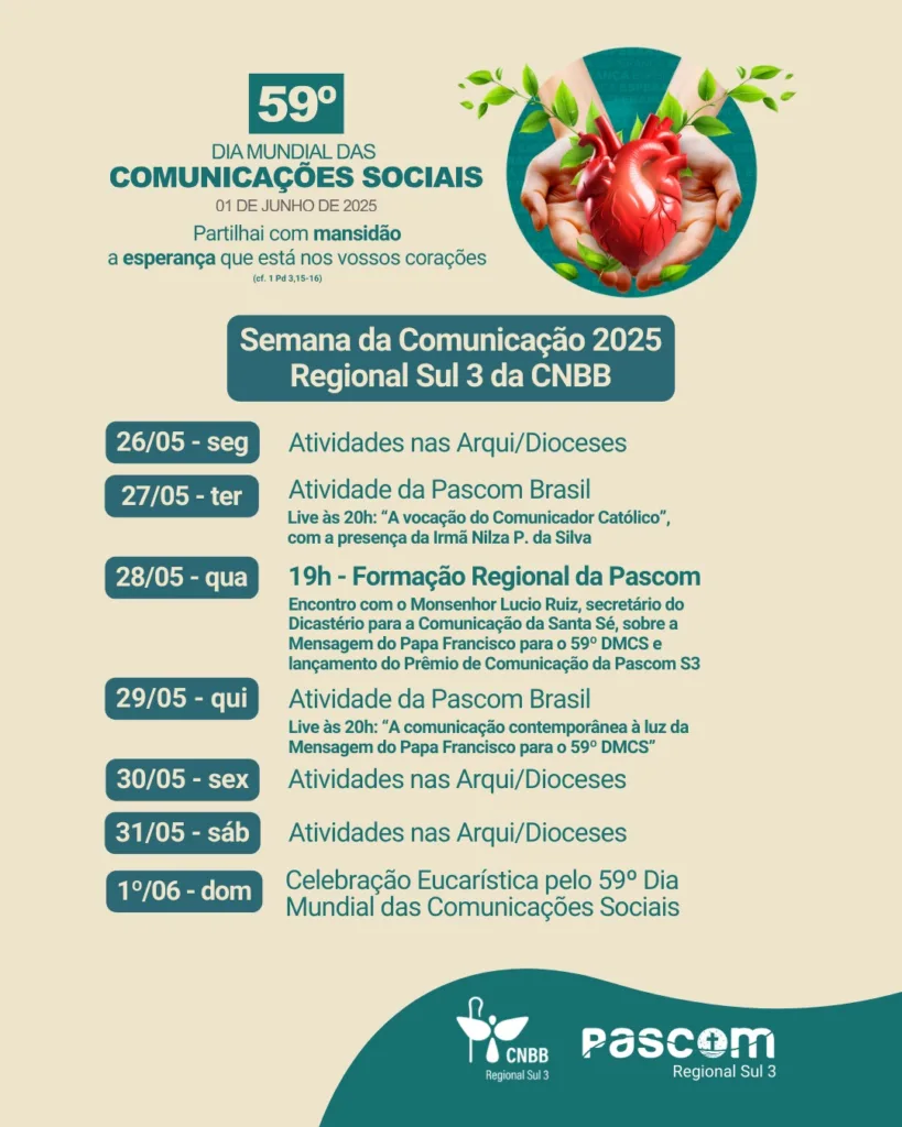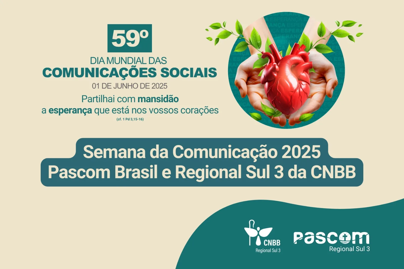 A Pastoral da Comunicação do Regional Sul 3 da CNBB, em sintonia com a Pascom Brasil, promove programação na 6ª Semana da Comunicação que ocorre entre os dias 26 de maio e 1º de junho de 2025, em celebração ao 59º Dia Mundial das Comunicações Sociais. Com o tema “Partilhai com mansidão a esperança que está nos vossos corações” (cf. 1Pd 3,15-16), a iniciativa busca motivar agentes de pastoral, comunicadores e lideranças eclesiais a refletirem sobre a força transformadora da esperança e da escuta no ambiente comunicacional da Igreja.