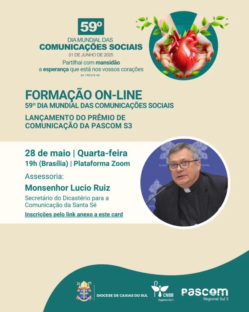 Um dos momentos mais esperados da programação regional será a formação online no dia 28 de maio, às 19h, com o Monsenhor Lucio Ruiz, secretário do Dicastério para a Comunicação do Vaticano. Ele conduzirá um encontro sobre a Mensagem do Papa Francisco para o 59º Dia Mundial das Comunicações Sociais, aprofundando os pontos centrais da carta papal e sua aplicação pastoral nas realidades locais. A formação será transmitida pela plataforma Zoom e necessita de inscrição (gratuita) no link abaixo, com vagas limitadas. A formação também será disponibilizada nas redes sociais da Pascom Sul.
