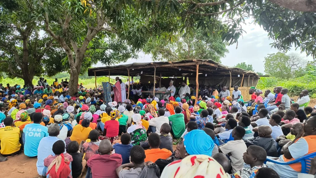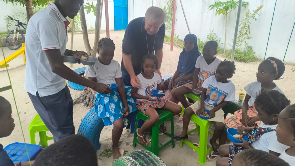 Durante uma das celebrações, os missionários receberam doações de alimentos como feijão e amendoim, oferecidos com grande entusiasmo pelas comunidades. “Foi emocionante ver a fila das pessoas com suas bandejas, partilhando o pouco que têm com alegria. É uma verdadeira lição de vida para nós”, contou o bispo.