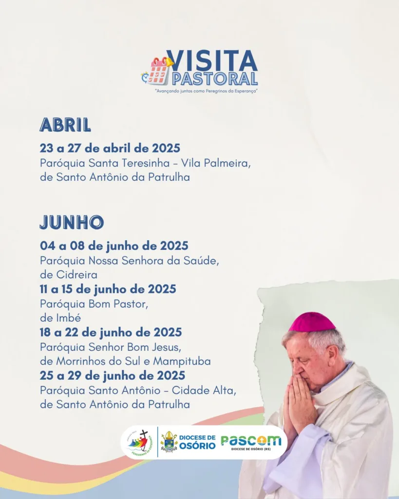 As paróquias da Diocese de Osório recebem a Visita Pastoral do bispo diocesano, dom Jaime Pedro Kohl. Na semana seguinte a cada visita, o bispo publicará suas impressões sobre o trabalho e a escuta realizados em cada paróquia. Das 23 paróquias, a primeira visitada foi a Santa Teresinha, na localidade Vila Palmeira, em Santo Antônio da Patrulha, entre os dias 23 e 27 de abril, de quarta a domingo.