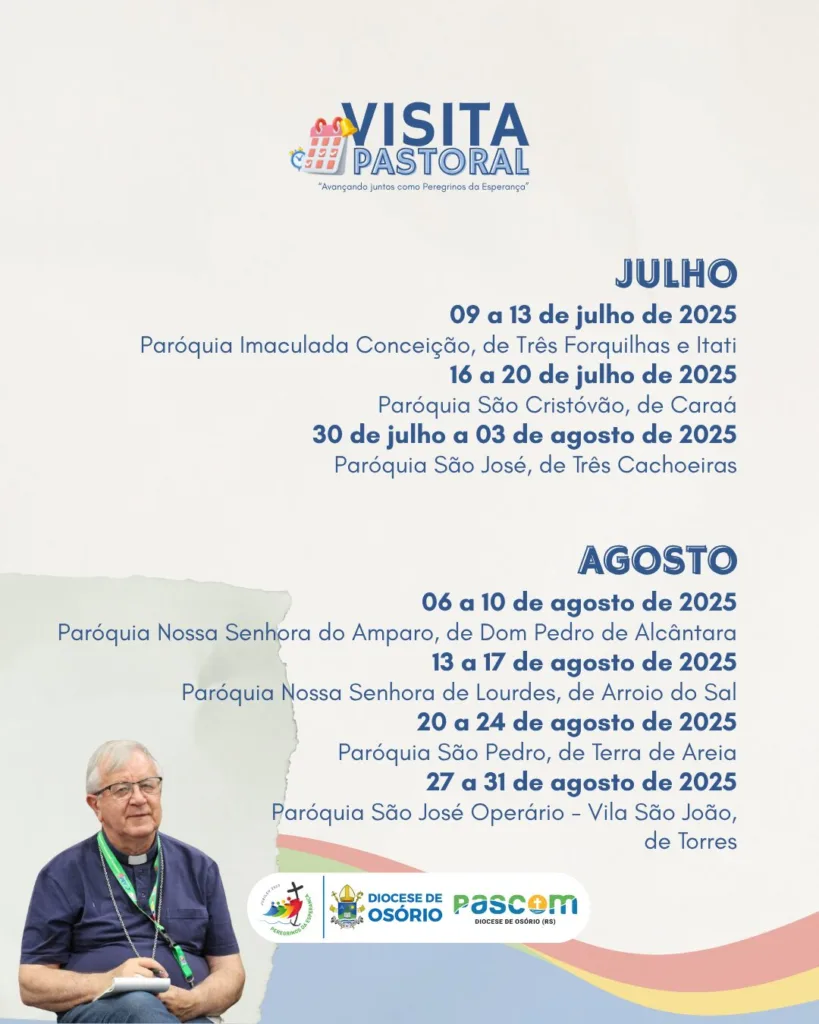 Além das atividades religiosas e pastorais, o bispo também pretende se encontrar com autoridades civis e representantes de instituições locais, como as ligadas à saúde, educação e assistência social, conforme as necessidades de cada paróquia.
