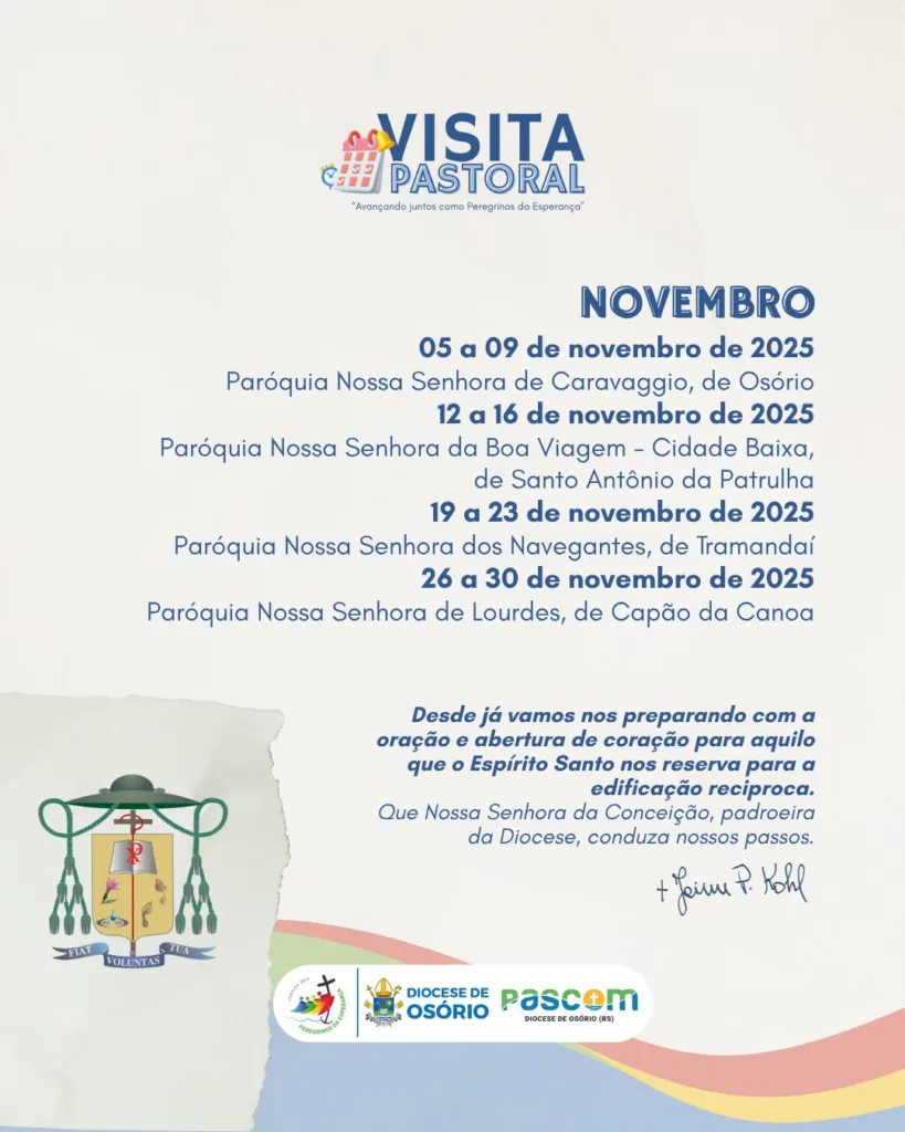 A visita, que começará no dia 23 de abril, na Paróquia Santa Teresinha, localizada na Vila Palmeira, em Santo Antônio da Patrulha, e será uma verdadeira maratona pastoral que se estenderá até o final de novembro, com dom Jaime permanecendo em cada paróquia de quarta-feira a domingo, conforme as possibilidades de cada comunidade. A visita culminará no dia 30 de novembro, na Paróquia Nossa Senhora de Lourdes, em Capão da Canoa.