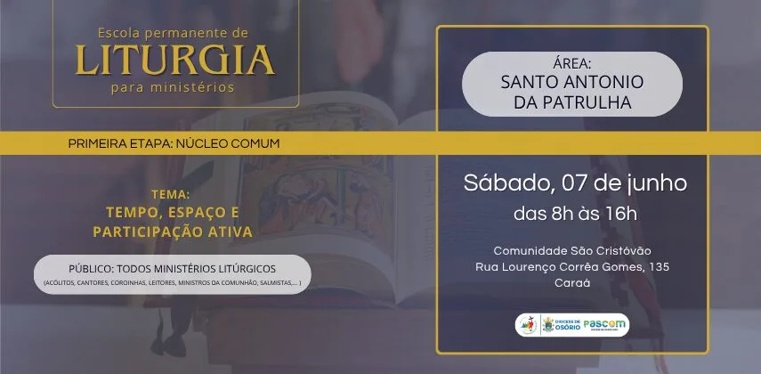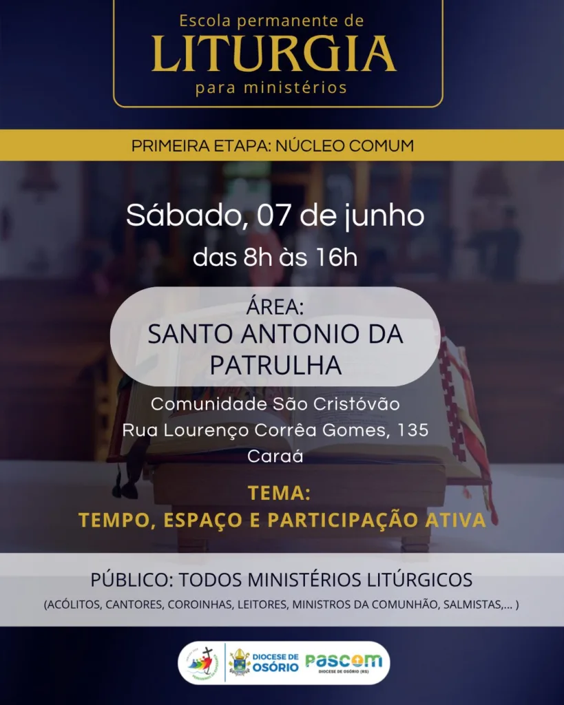 A Escola de Liturgia, promovida pela Comissão Diocesana de Liturgia (CDL) como uma das ações previstas no Plano de Pastoral da Diocese, segue com suas atividades e, no sábado, dia 07 de junho, será a vez da Área Pastoral de Santo Antônio da Patrulha participar da formação.