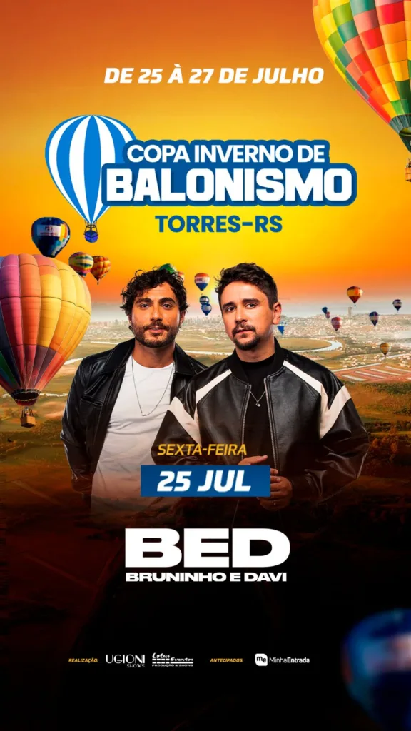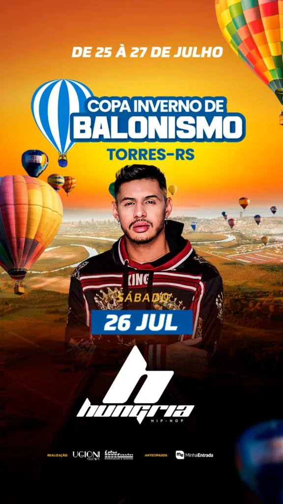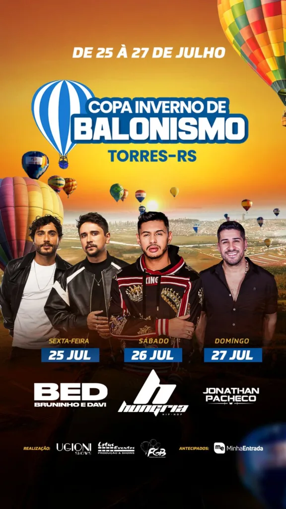 A Copa Inverno de Balonismo reúne em um só lugar a paixão pelos balões e o talento musical, criando um ambiente que une esportes, arte, cultura e gastronomia. O festival é a escolha ideal para aproveitar momentos especiais ao lado de quem você ama. Com atrações para todas as idades, o evento promete ser um ponto de encontro para famílias, amigos e todos que apreciam a beleza do balonismo e a vibração dos grandes shows.