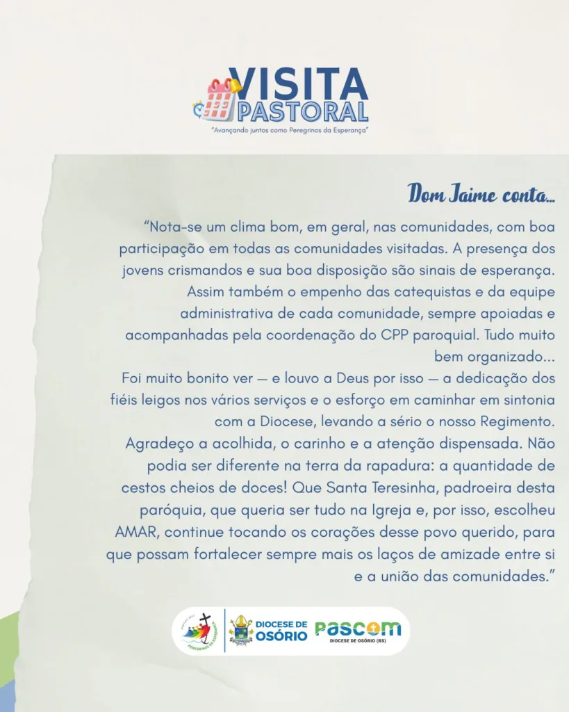 O bispo da Diocese de Osório, dom Jaime Pedro Kohl, iniciou no dia 23 de abril de 2025 a série de Visitas Pastorais programadas para todas as 23 paróquias de seu território eclesial. A primeira visita foi realizada na Paróquia Santa Teresinha, localizada na Vila Palmeira, em Santo Antônio da Patrulha.