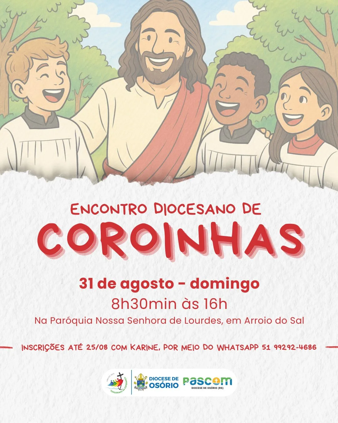 O evento acontecerá na Paróquia Nossa Senhora de Lourdes, em Arroio do Sal, das 8h30 às 16h, e reunirá coroinhas e assessores das 23 paróquias que compõem a diocese. As inscrições estão abertas até o dia 25/08, por meio do WhatsApp (51) 99292-4686, com Karine.