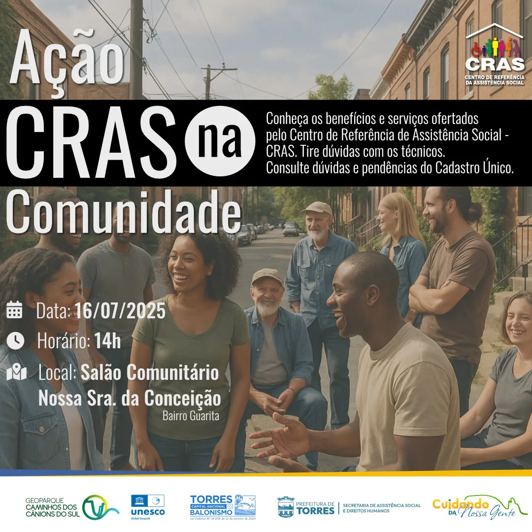 No dia 16 de julho, às 14h, o Centro de Referência de Assistência Social (CRAS) realizará uma ação comunitária no Salão Comunitário Nossa Senhora da Conceição, localizado no Bairro Guarita.