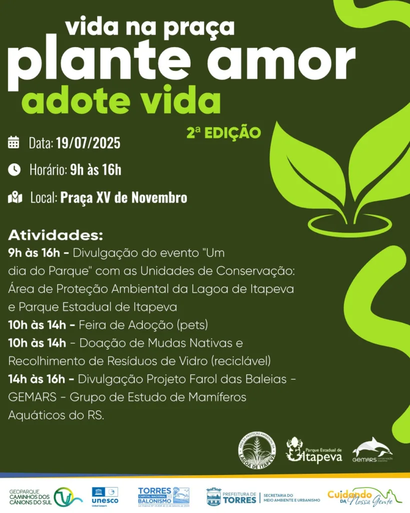 No próximo sábado (19), a Praça XV de Novembro, em Torres, recebe a segunda edição do evento “Vida na Praça, Plante Amor, Adote Vidas”. A iniciativa acontece das 9h às 16h e reúne ações de adoção responsável de animais, educação ambiental e incentivo à sustentabilidade.