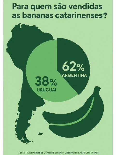 De acordo com o painel temático de Comércio Exterior do Observatório Agro Catarinense, Santa Catarina se mantém como o maior exportador de bananas do Brasil em 2025. Entre janeiro e junho, o Brasil exportou 43,8 mil toneladas de banana, com receita de US$ 15,7 milhões. Santa Catarina foi responsável por praticamente 50% do volume exportado, com 21,8 mil toneladas, o que representa um crescimento de 103% em relação ao mesmo período de 2024. O estado gerou US$ 7,2 milhões, equivalente a 45,9% da receita nacional com exportações de banana no primeiro semestre de 2025.