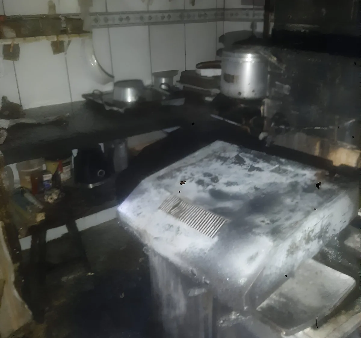 Ao chegar no local, os bombeiros constataram que o fogo estava concentrado na área da cozinha de uma edificação comercial de aproximadamente 80 metros quadrados. O disjuntor de energia já estava desligado, e o proprietário do estabelecimento havia iniciado o combate às chamas com dois extintores. A guarnição utilizou uma linha de ataque direto com o mangotinho, empregando cerca de 500 litros de água para controlar o fogo.