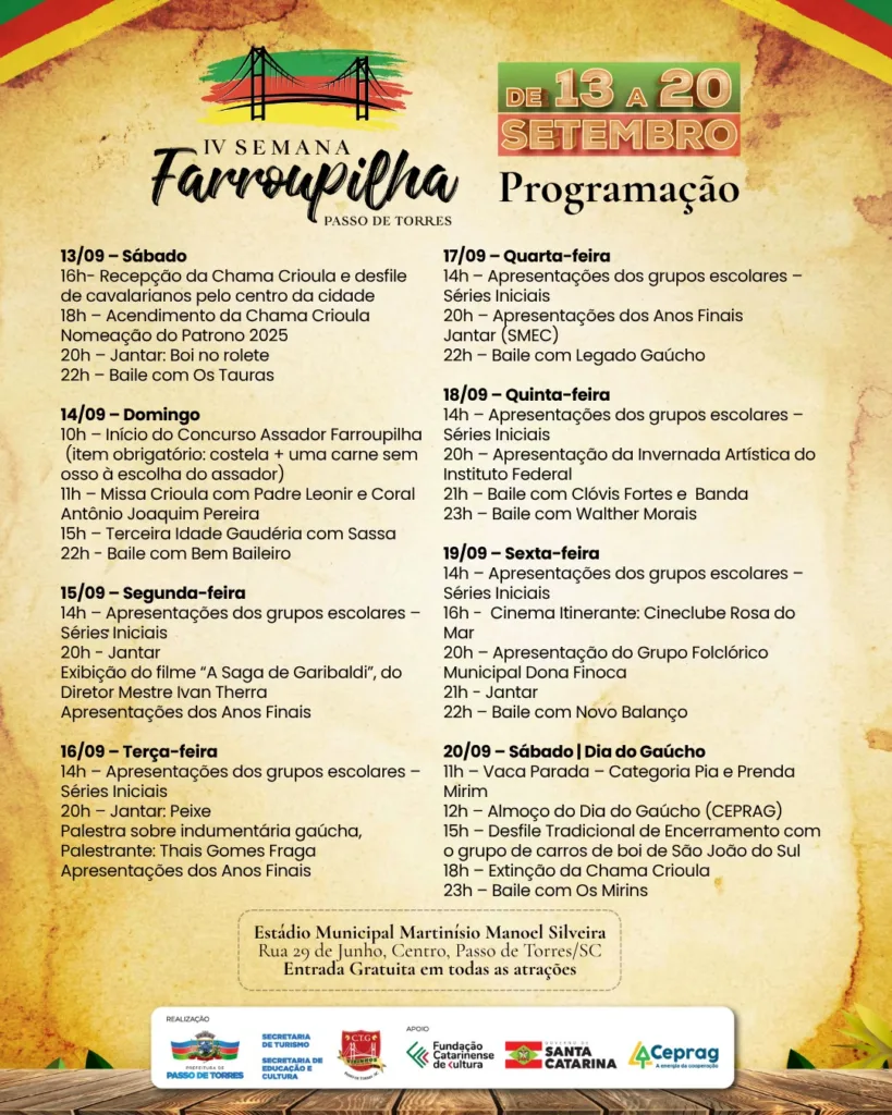 O município de Passo de Torres divulgou oficialmente a programação da IV Semana Farroupilha, que acontece de 13 a 20 de setembro de 2025, no Estádio Municipal Martinísio Manoel Silveira. A entrada é gratuita em todas as atividades. O evento, que já integra o calendário cultural da cidade, celebra as tradições gaúchas com uma extensa agenda de apresentações, bailes, concursos, jantares típicos, cinema e atividades voltadas à valorização da cultura tradicionalista.