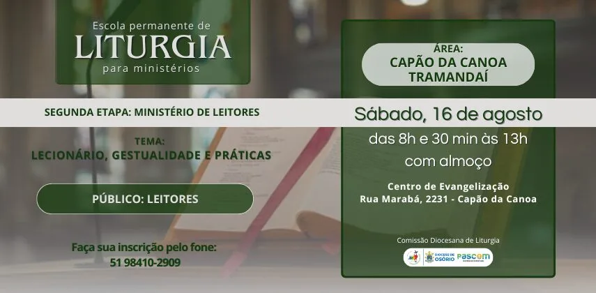 No próximo dia 16 de agosto, sábado, a Diocese de Osório, por meio da Comissão Diocesana de Liturgia (CDL), realiza a segunda etapa da Escola de Liturgia voltada à Área Pastoral de Capão da Canoa e Tramandaí, em sintonia com o Plano de Pastoral da Diocese. O encontro reunirá fiéis das paróquias Nossa Senhora de Lourdes (Capão da Canoa), Nossa Senhora dos Navegantes (Tramandaí), Bom Pastor (Imbé) e São Pedro (Xangri-lá).