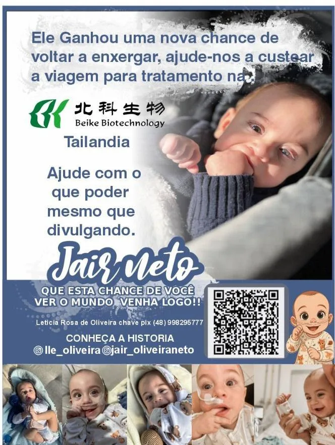 Uma corrente de solidariedade se formou no extremo sul de Santa Catarina em prol do pequeno Jair Neto, de apenas 1 ano e 3 meses. Sua mãe, a torrense Letícia Oliveira, moradora de Sombrio há 17 anos, iniciou uma campanha para arrecadar R$ 300.000,00, valor necessário para custear um tratamento com células-tronco na Tailândia, que representa a esperança de reverter a perda de visão do filho.