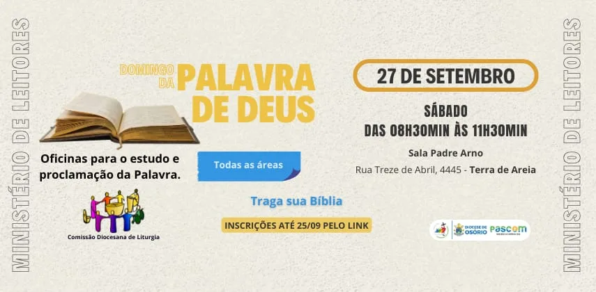 A Comissão Diocesana de Liturgia (CDL) da Diocese de Osório está convidando todos os fiéis, especialmente aqueles que servem ou desejam servir como leitores em suas comunidades, para participarem das “Oficinas práticas de estudo, preparação e proclamação da Palavra”. O evento coroa um semestre de formação que percorreu as seis áreas pastorais da Diocese.