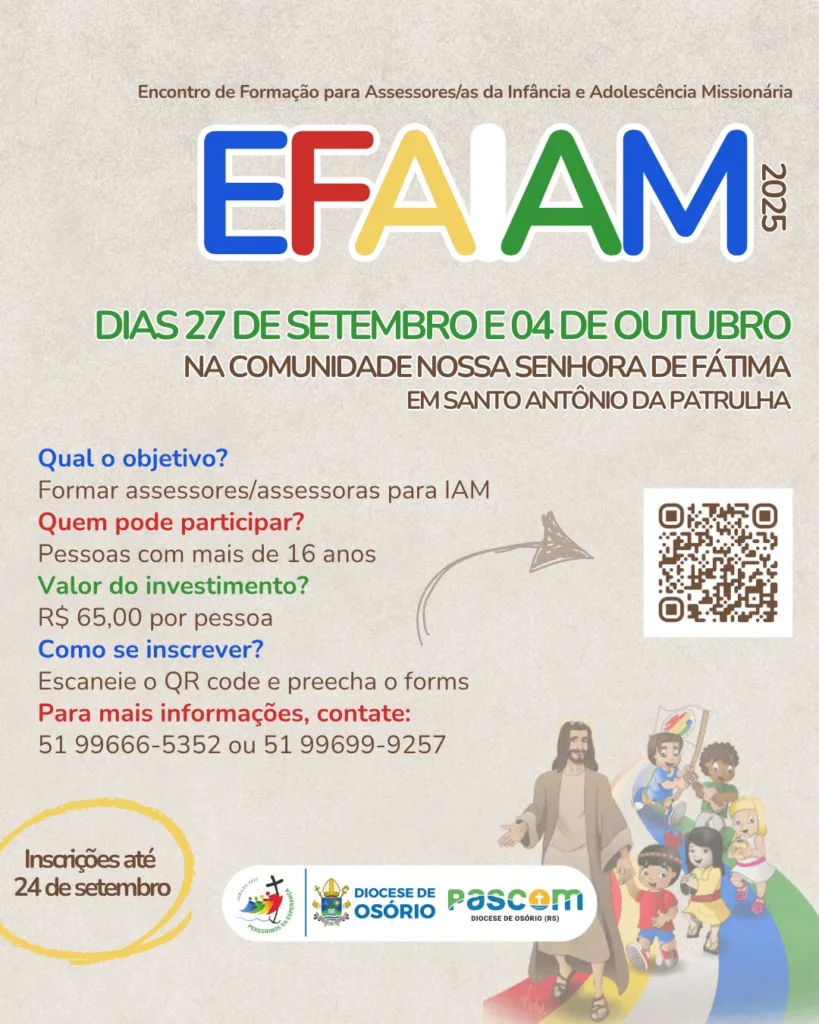 A Diocese de Osório, por meio do Conselho Missionário Diocesano (COMIDI), promoverá nos dias 27 de setembro e 4 de outubro de 2025, sábados, o Encontro de Formação para novos Assessores da Infância e Adolescência Missionária (EFAIAM), destinado a jovens, a partir dos 16 anos, e adultos que desejam se dedicar à missão de acompanhar grupos de crianças e adolescentes em suas comunidades. A formação acontecerá na comunidade Nossa Senhora de Fátima, localizada na Rua Edemar da Silva Braga, nº 305, Bairro Várzea, em Santo Antônio da Patrulha, na Paróquia Santo Antônio. A formação é aberta a participantes de todas as paróquias da Diocese.