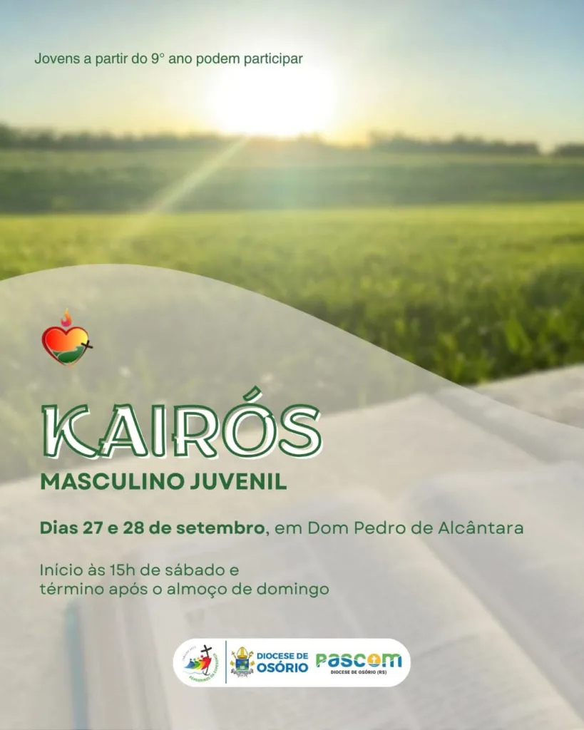 A Diocese de Osório, por meio do Serviço de Animação Vocacional (SAV), promove nos dias 27 e 28 de setembro, em Dom Pedro de Alcântara, o Kairós Masculino Juvenil, encontro voltado a adolescentes e jovens do sexo masculino, a partir do 9º ano do Ensino Fundamental. A programação inicia no sábado (27), às 15h, e encerra no domingo (28) após o almoço.
