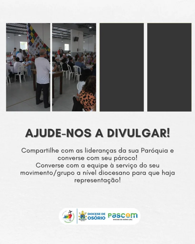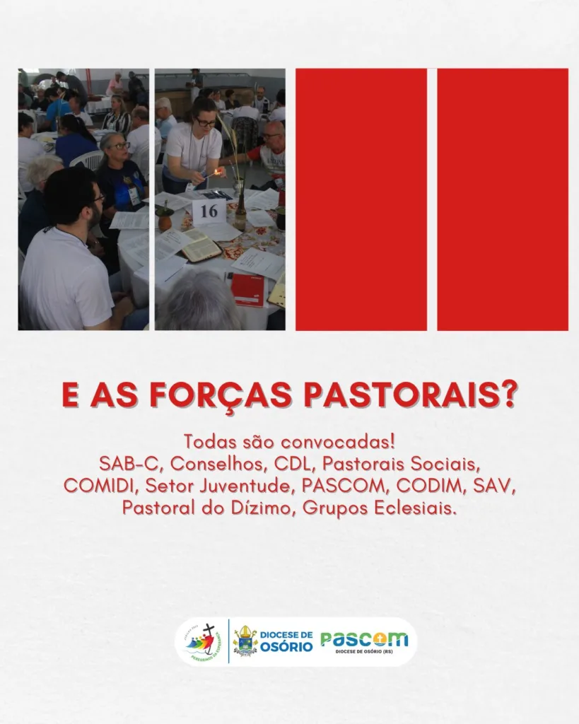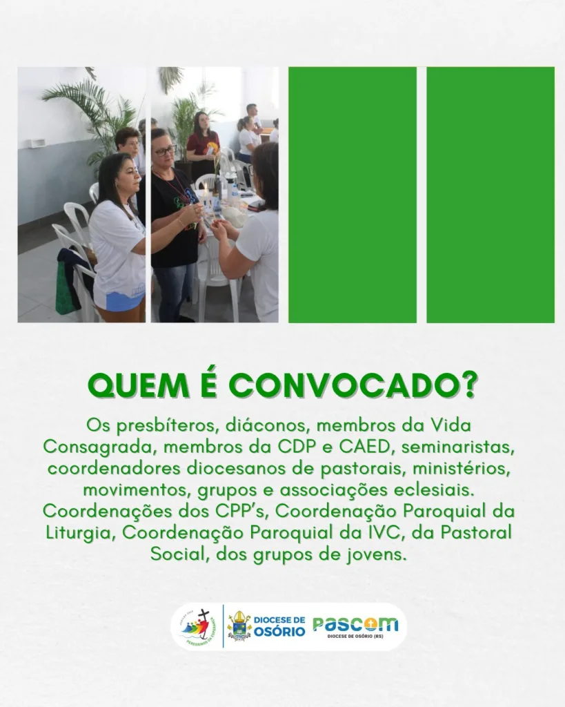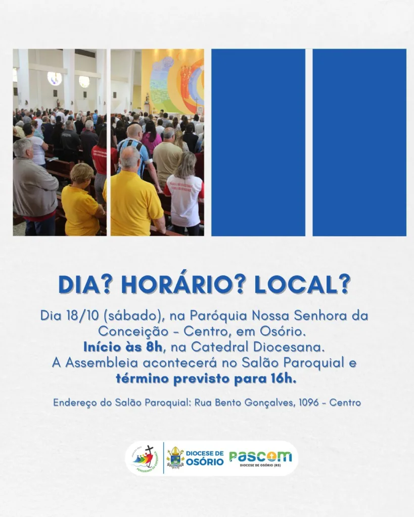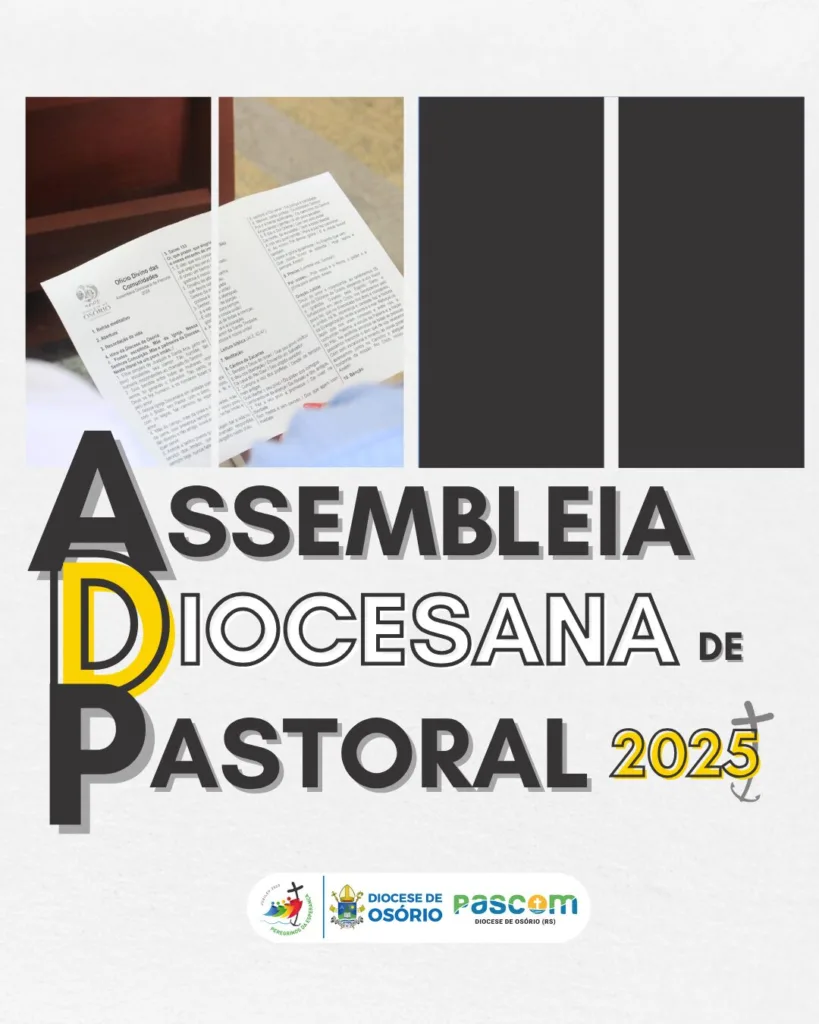 A Diocese de Osório realiza no dia 18 de outubro, sábado, a Assembleia Diocesana de Pastoral (ADP 2025), um dos momentos mais importantes de comunhão e escuta da Igreja Particular no Litoral Norte gaúcho. O encontro será aberto com oração às 8h, na Catedral Nossa Senhora da Conceição, e prosseguirá durante o dia no salão paroquial, na Rua Bento Gonçalves, 1096, no Centro de Osório.