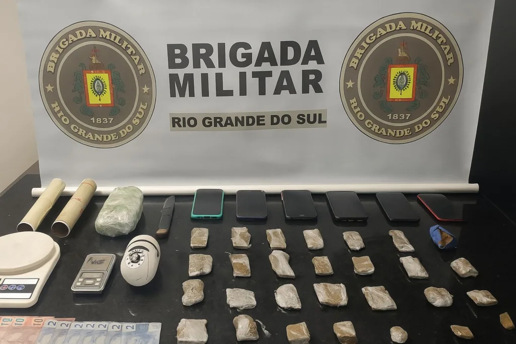 Já na noite de sábado (11), outra ocorrência foi registrada em Cidreira, no bairro Costa do Sol. Durante patrulhamento, uma equipe do 1º Batalhão de Polícia de Choque avistou um homem que tentou fugir ao perceber a aproximação da viatura. Ele foi perseguido, abordado e preso por tráfico de drogas. Com o suspeito, os policiais encontraram um tijolo de maconha pesando 394 gramas, 28 porções da mesma droga prontas para a venda, duas balanças de precisão, seis celulares, uma faca, R$ 114 em dinheiro, uma câmera de segurança e materiais para embalar entorpecentes. O homem, que já tinha antecedentes por tráfico e homicídio, foi encaminhado à Delegacia de Polícia.