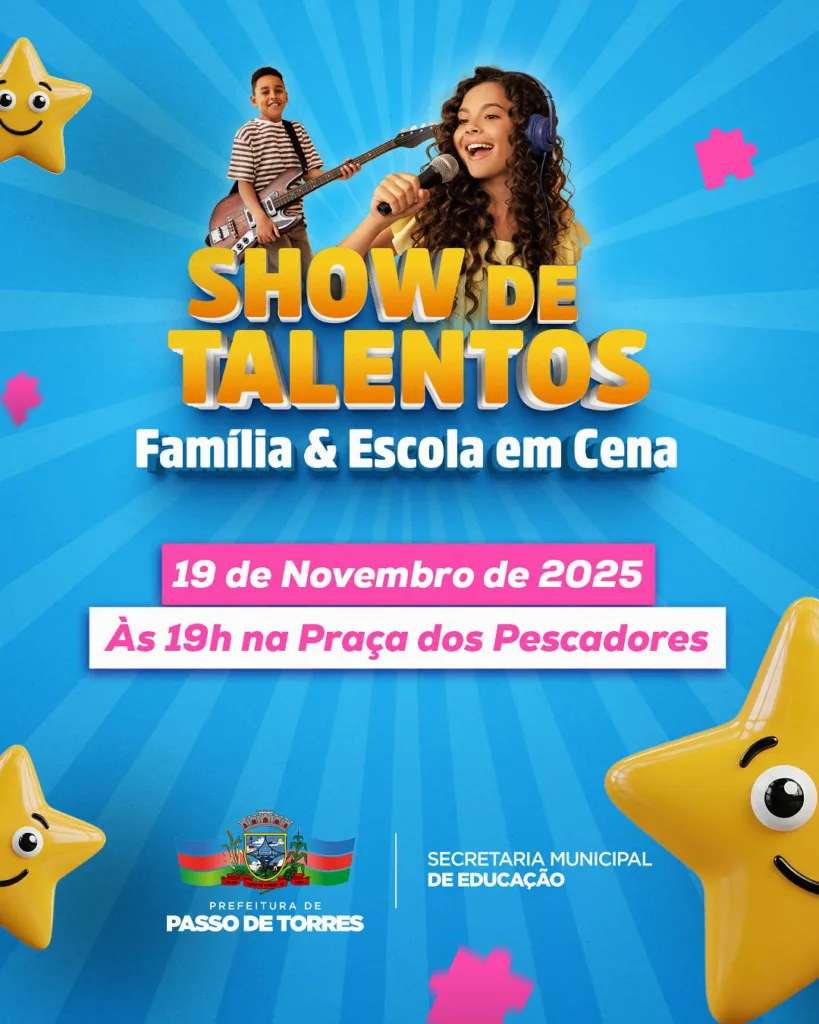 A Prefeitura de Passo de Torres, no Sul catarinense, por meio da Secretaria Municipal de Educação, promove no dia 19 de novembro de 2025, a partir das 19h, o Show de Talentos, Família & Escola em Cena, na Praça dos Pescadores.