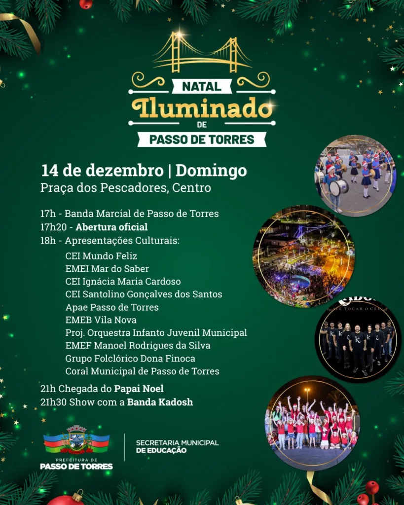 A Prefeitura de Passo de Torres, no Sul catarinense, promove no próximo domingo (14) mais uma edição do Natal Iluminado, na Praça dos Pescadores, no Centro. As atividades iniciam às 17h, com a apresentação da Banda Marcial de Passo de Torres.
