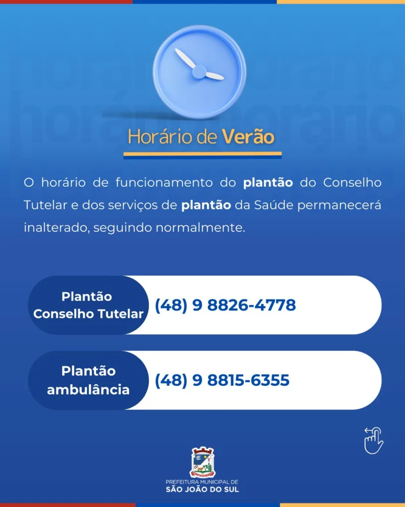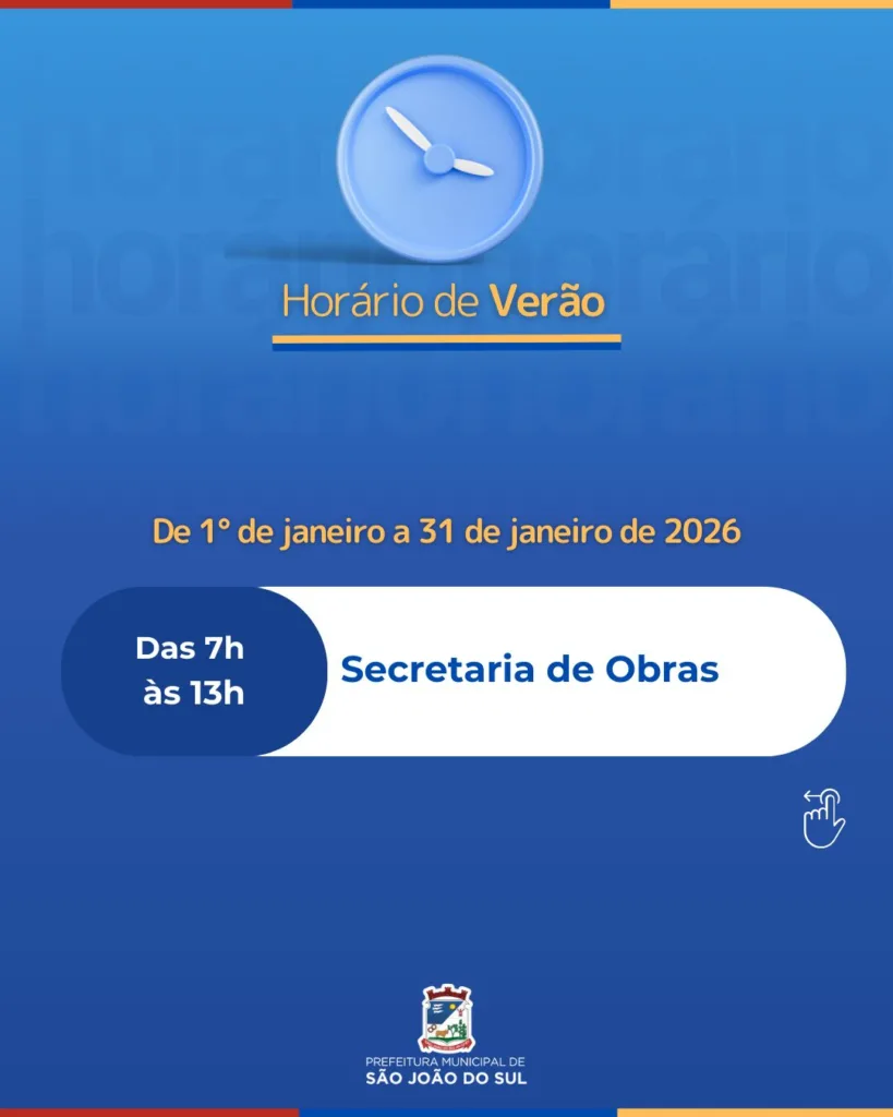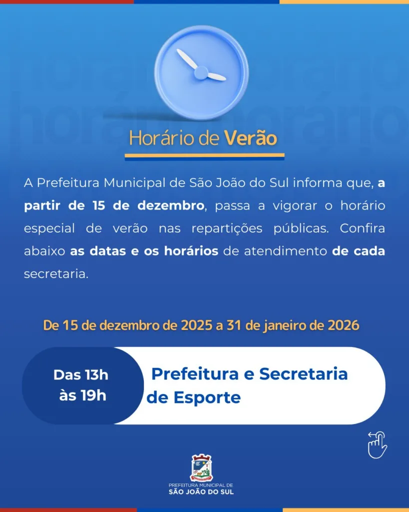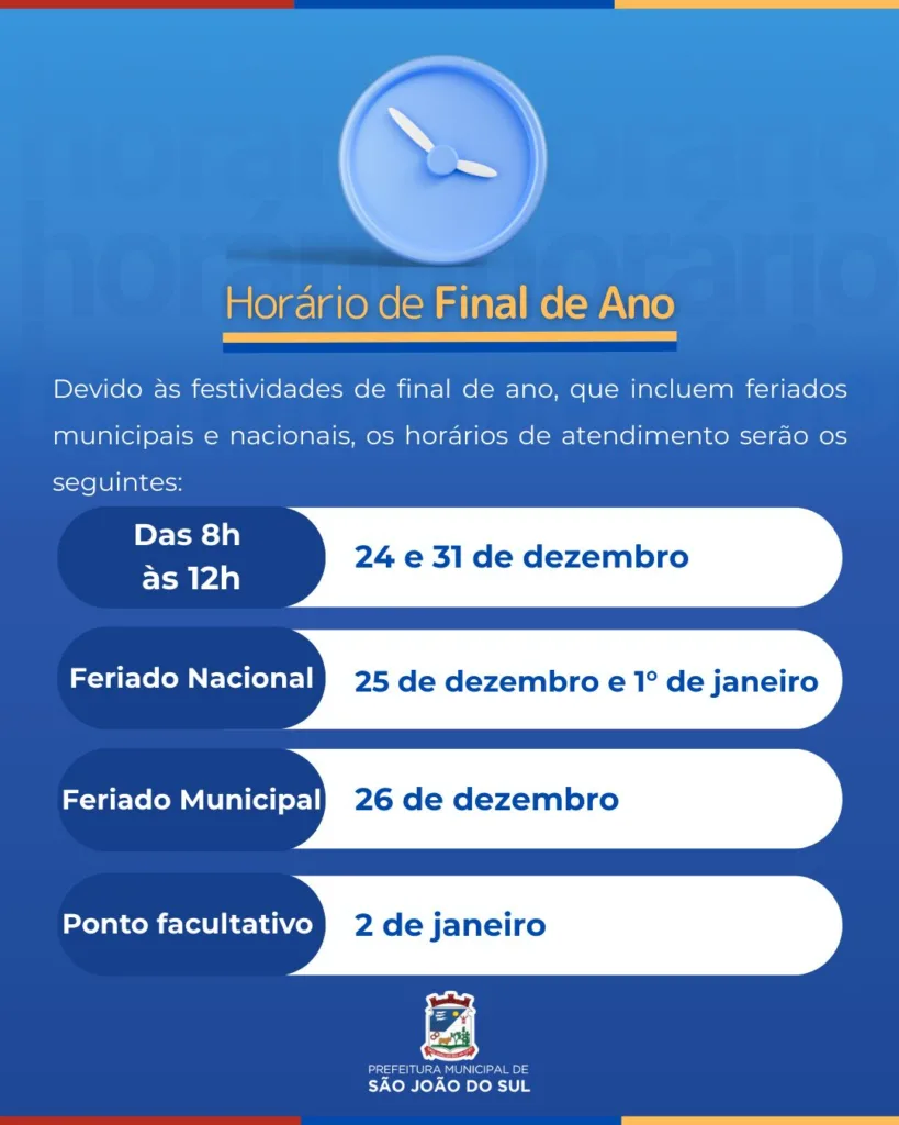 A Prefeitura Municipal de São João do Sul, no Sul catarinense, informou à população e aos colaboradores os horários de funcionamento das repartições públicas durante o fim de ano e o verão. O comunicado detalha as datas e horários específicos de atendimento de cada secretaria municipal.
