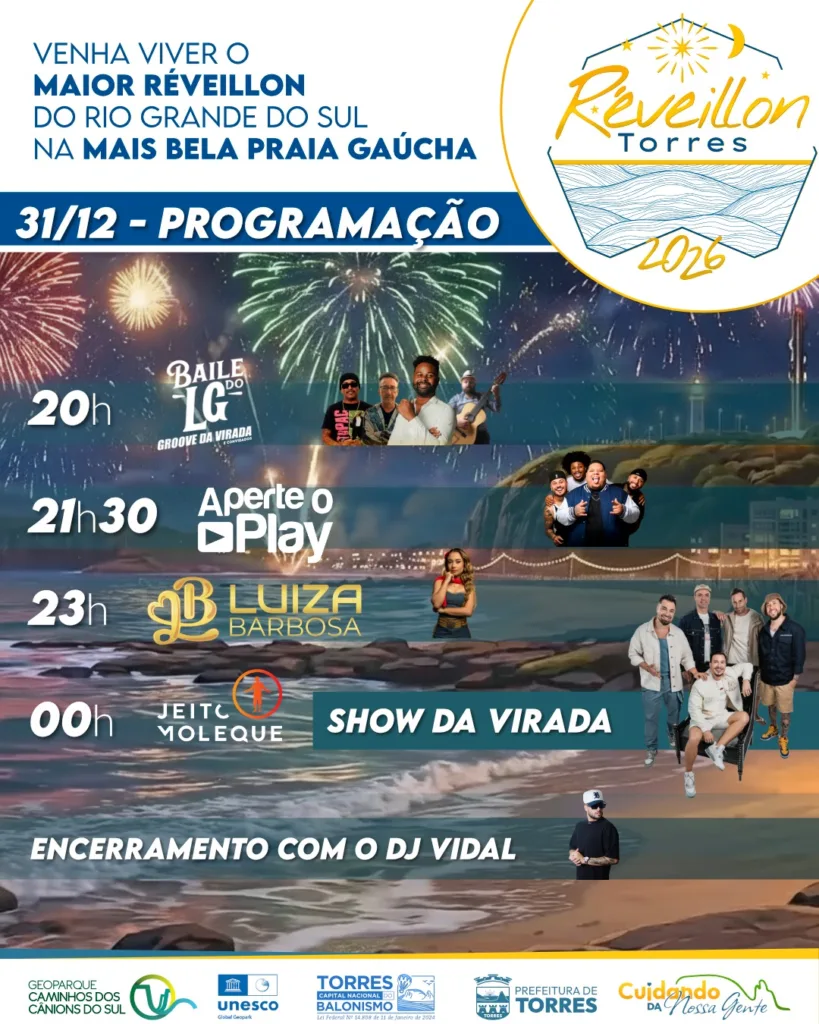 Entre as novidades para a temporada está a pré-virada de ano no dia 30 de dezembro, que contará com apresentações de artistas locais e regionais, DJs e bandas de diferentes estilos musicais, como pop, rock, sertanejo, gauchesco e pagode. A programação inclui nomes consagrados, como a banda Indústria Nacional, o DJ Henrique Matos, a banda Aperte o Play e o baile do LG, que trará samba e pagode, além de um pocket show da semifinalista do The Voice, Luisa Barbosa, oferecido pela Secretaria Estadual de Turismo. A queima de fogos, limitada a 15 minutos, seguirá a legislação vigente, garantindo espetáculo visual sem ultrapassar os limites de decibéis permitidos.