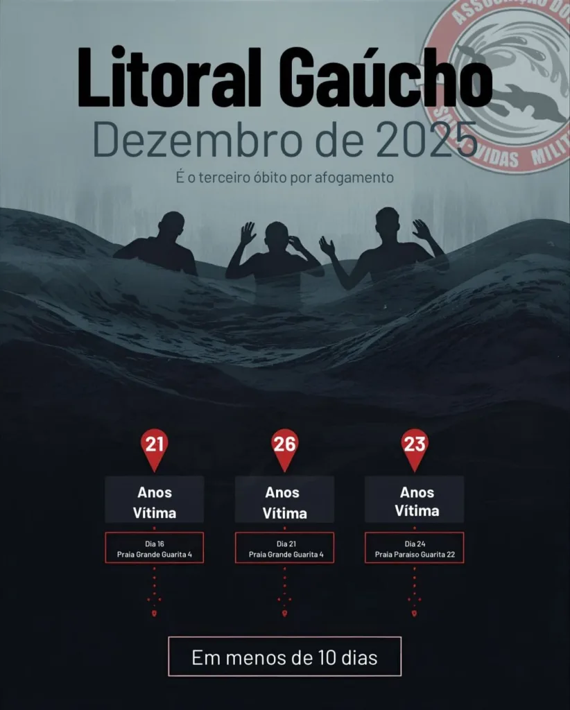 O litoral do Rio Grande do Sul registrou, em menos de 10 dias, três mortes por afogamento em Torres, levando a Associação dos Salva-vidas Militares do Estado (Asavime) a emitir um comunicado de alerta em suas redes sociais. A entidade destacou o esforço diário dos guarda-vidas, que enfrentam condições cada vez mais difíceis devido à redução de efetivo e de recursos, e conclamou a sociedade e autoridades para ações concretas de prevenção.