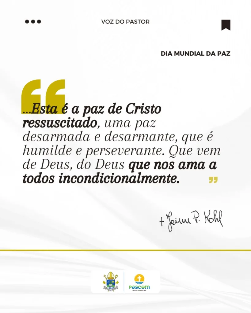 A paz que desejamos a todos neste Dia Mundial da Paz é essa que o Papa Leão propôs na sua primeira bênção: “A paz esteja com todos vós! Esta é a primeira saudação de Cristo ressuscitado, o bom pastor que deu a vida pelo rebanho de Deus. Também eu gostaria que esta saudação de paz entrasse no vosso coração, chegasse às vossas famílias, a todas as pessoas, onde quer que se encontrem, a todos os povos e a toda a terra. A paz esteja convosco! Esta é a paz de Cristo ressuscitado, uma paz desarmada e desarmante, que é humilde e perseverante. Que vem de Deus, do Deus que nos ama a todos incondicionalmente”.