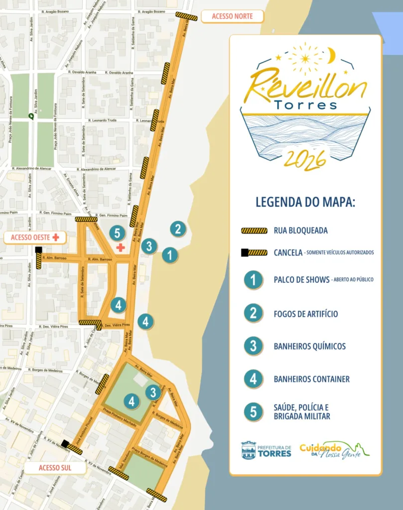 A Administração municipal de Torres informa que, nesta terça-feira, 31 de dezembro, o município terá bloqueios temporários de trânsito em vias do Centro e da orla em função da programação especial de Réveillon, que inclui shows e a tradicional queima de fogos. A medida integra o plano operacional do evento e tem como foco a segurança do público e a fluidez da organização urbana durante as celebrações.