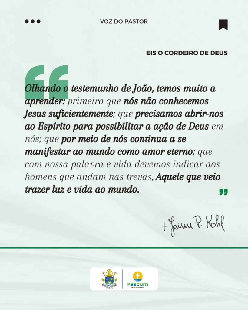 Em seu mais recente artigo pastoral, o bispo da Diocese de Osório, dom Jaime Pedro Kohl, propõe uma reflexão a partir do testemunho de João Batista sobre Jesus, conforme o Evangelho de João (Jo 1,29-34). Partindo da proclamação “Eis o Cordeiro de Deus que tira o pecado do mundo”, o bispo destaca que o início da vida pública de Jesus está profundamente ligado à missão do precursor, que, iluminado pelo Espírito Santo, reconhece e anuncia Jesus como o Filho de Deus e o Messias esperado. Essa afirmação, segundo dom Jaime, é central para compreender o sentido da vida, da missão e da entrega de Cristo pela salvação da humanidade.