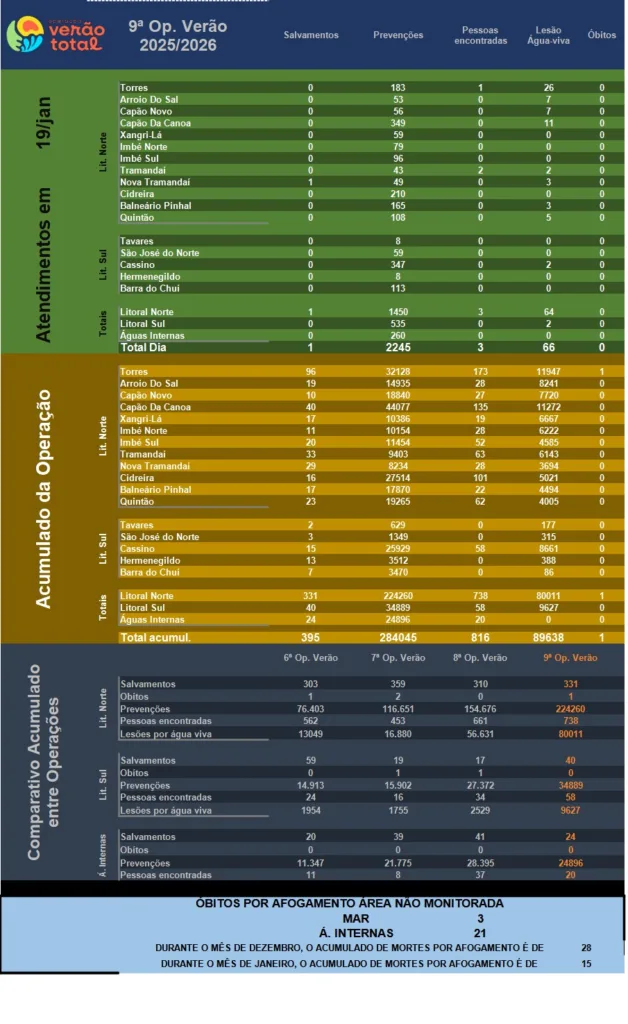 Desde o início da operação, o Litoral Norte concentra a maior parte das ocorrências. São 331 salvamentos, 224.260 ações preventivas, 738 pessoas encontradas e 80.011 registros de lesões por água-viva. Municípios como Torres, Capão da Canoa, Tramandaí, Cidreira e Balneário Pinhal aparecem entre os pontos com maior volume de atendimentos, refletindo o fluxo elevado de banhistas nesta temporada.