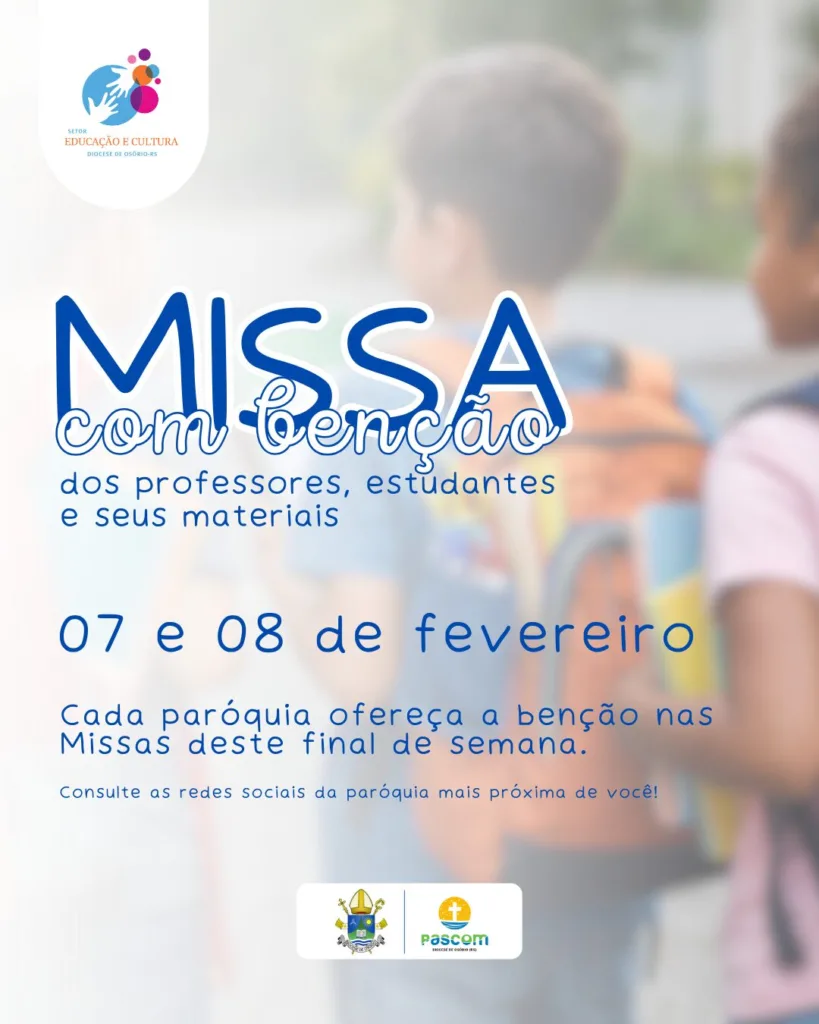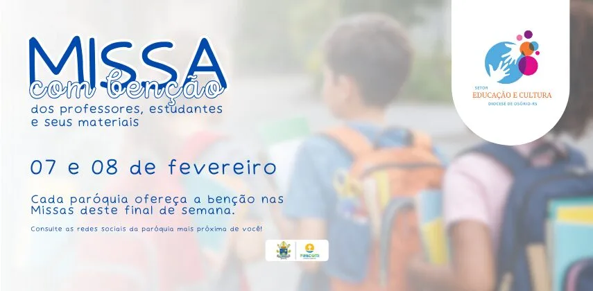 O Setor de Educação e Cultura da Diocese de Osório está mobilizando as 23 paróquias da Diocese de Osório para a realização da Missa com bênção dos professores, estudantes e de seus materiais escolares, marcando o início do ano letivo de 2026 sob a luz da fé e da proteção divina. A proposta prevê a realização da iniciativa no final de semana dos dias 7 e 8 de fevereiro, com a orientação de que cada paróquia inclua a bênção dos professores, estudantes e de seus materiais escolares nas Missas celebradas nesse período.