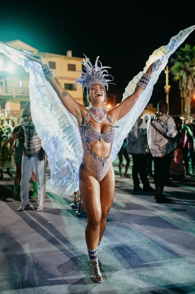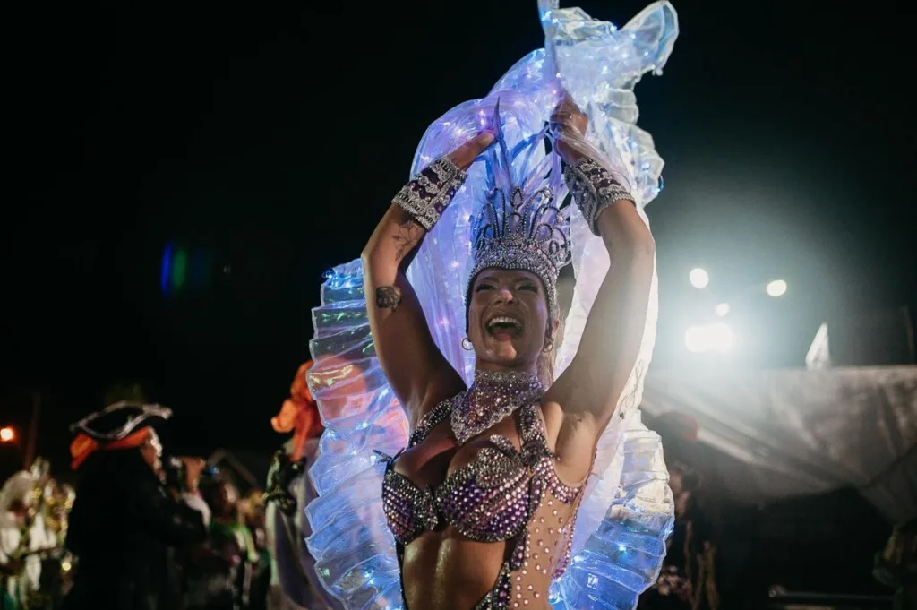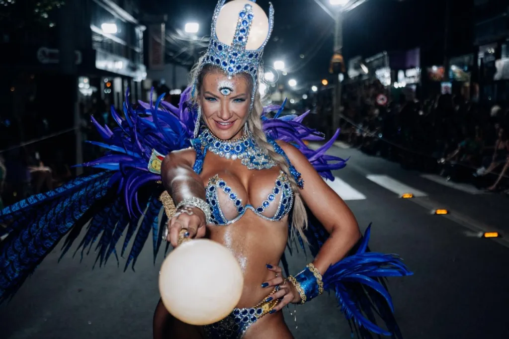Para Laura o Carnaval só se sustenta quando se renova. Cerca de 70% dos integrantes das escolas são veranistas, pessoas que chegam, se encantam, permanecem e retornam. É gestão de cultura na prática. A avenida vira ativo simbólico do município, impulsiona turismo, movimenta a economia local e consolida identidade regional. Nesse contexto, a figura da musa deixa de ser apenas estética e assume papel de liderança informal, referência e vetor de engajamento.