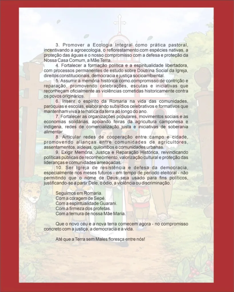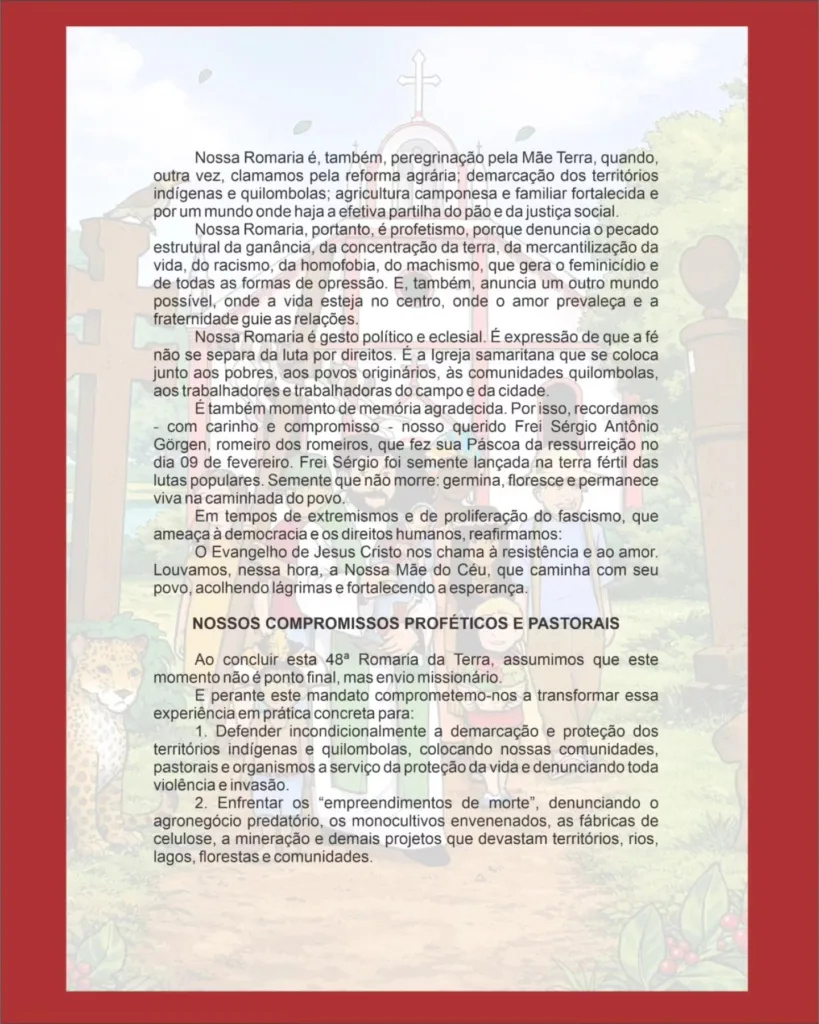 A 48ª Romaria teve como tema os 400 anos da evangelização missioneira e seu caráter espiritual e político. A carta final denunciou injustiças históricas contra povos indígenas, quilombolas e comunidades camponesas, criticou o agronegócio predatório, monocultivos envenenados, mineração e projetos considerados devastadores dos territórios. O documento defendeu reforma agrária, agroecologia, reflorestamento com espécies nativas, proteção das águas e fortalecimento da democracia.