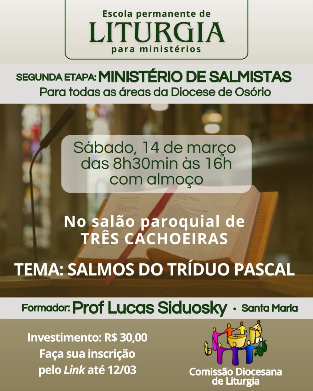 A Comissão Diocesana de Liturgia, em consonância com o Plano de Pastoral, realiza no mês de março uma formação voltada aos salmistas de todas as Áreas Pastorais da Diocese de Osório. A iniciativa integra a Escola Permanente de Liturgia para Ministérios e tem como foco o aprofundamento dos Salmos Responsoriais do Tríduo Pascal, elemento central da celebração litúrgica pascal.