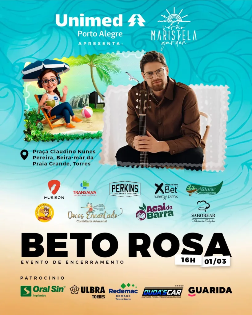 O Verão Maristela Garden também conta com patrocínio de Oral Sin Implantes, Ulbra Torres, Redemac Bomagg, Duda’s Car e Guarida, valorizando o verão no Litoral Norte gaúcho.