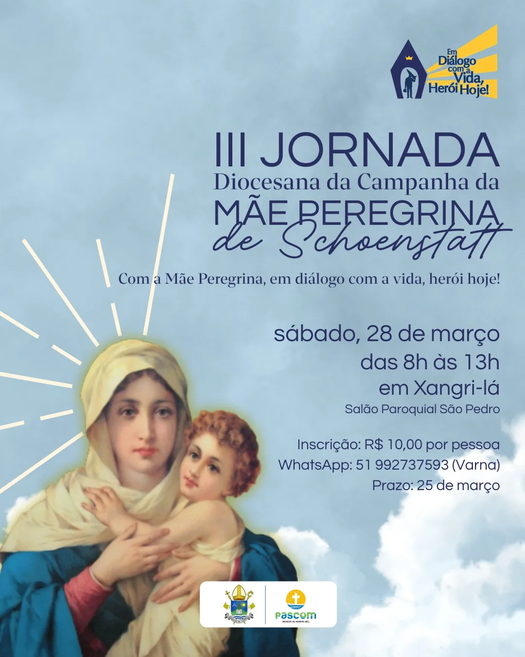 A Diocese de Osório promove no sábado, 28 de março, a III Jornada Diocesana da Campanha da Mãe Peregrina de Schoenstatt, um momento de formação, espiritualidade e partilha aberto não apenas aos integrantes do Movimento, mas a todos que desejam conhecer mais de perto sua missão evangelizadora. O encontro será realizado das 8h às 13h, no Salão Paroquial da Paróquia São Pedro, em Xangri-lá.