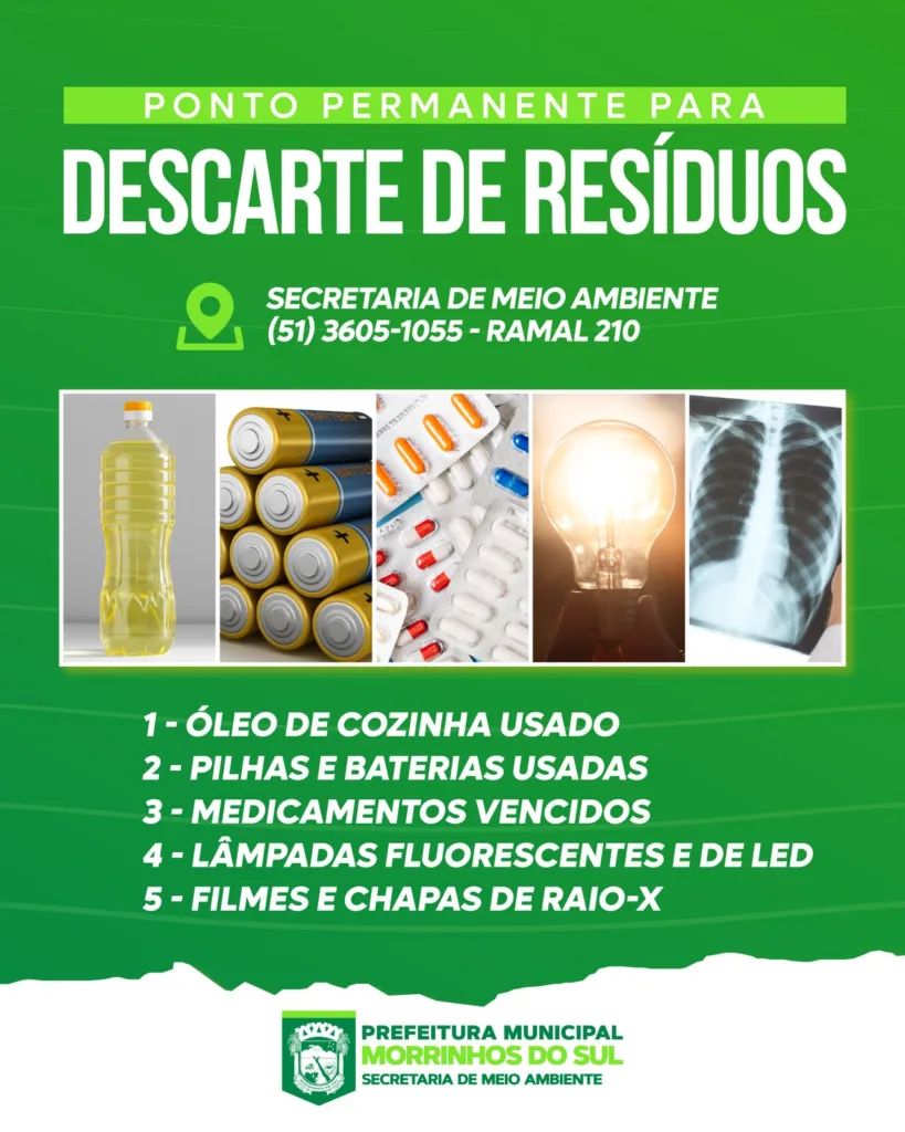 A Prefeitura de Morrinhos do Sul, por meio da Secretaria Municipal de Meio Ambiente, reforça à população a disponibilidade do ponto permanente para descarte de resíduos no município. O serviço funciona durante todo o ano e permite que moradores façam a destinação correta de materiais que não devem ser colocados no lixo comum.
