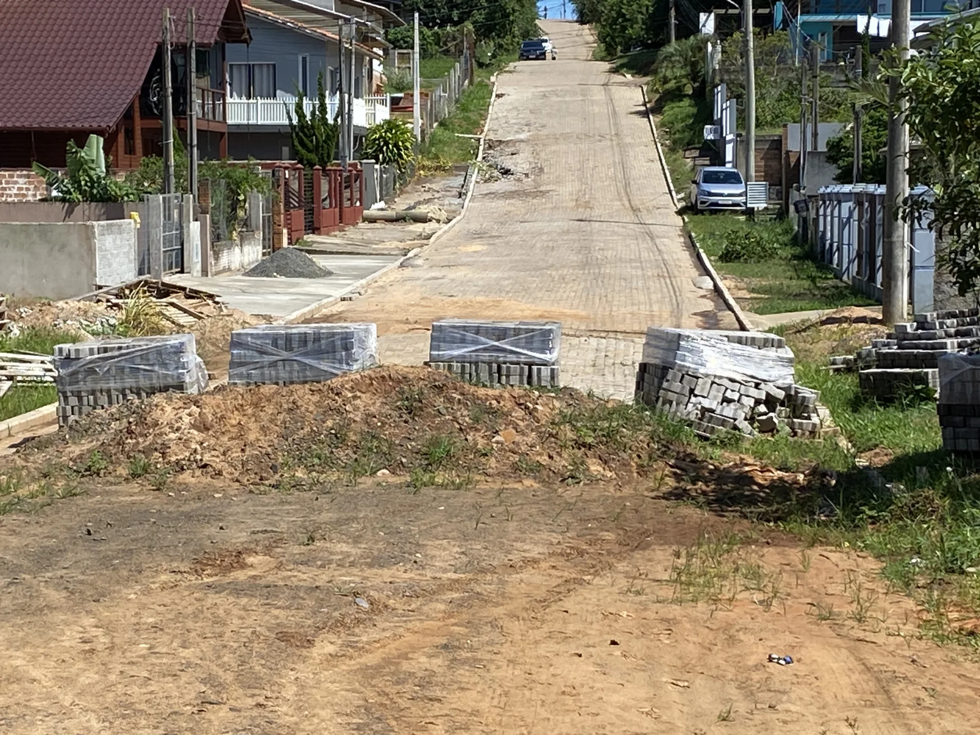 No local ainda é possível observar materiais utilizados na pavimentação, como meio-fio e blocos de PAVS, que permanecem na rua aguardando a retomada dos trabalhos. Moradores relatam que, durante o período em que as obras estavam em andamento, alguns trechos chegaram a ficar totalmente bloqueados, dificultando inclusive o acesso de carros às residências.