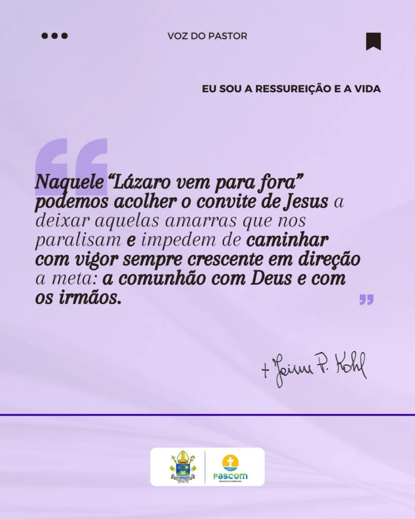 A mensagem destaca que Cristo é o centro da história humana e fundamento da esperança cristã, reafirmando que a fé dá sentido ao viver e ao morrer. Ao proclamar “Eu sou a ressurreição e a vida”, Jesus apresenta a salvação como caminho de comunhão com Deus e com os irmãos, convidando os fiéis a romperem as amarras que impedem a caminhada espiritual. A reflexão também ressalta a dimensão da fraternidade e da acolhida como sinais concretos do Reino, reforçando o chamado à renovação interior própria do período quaresmal.