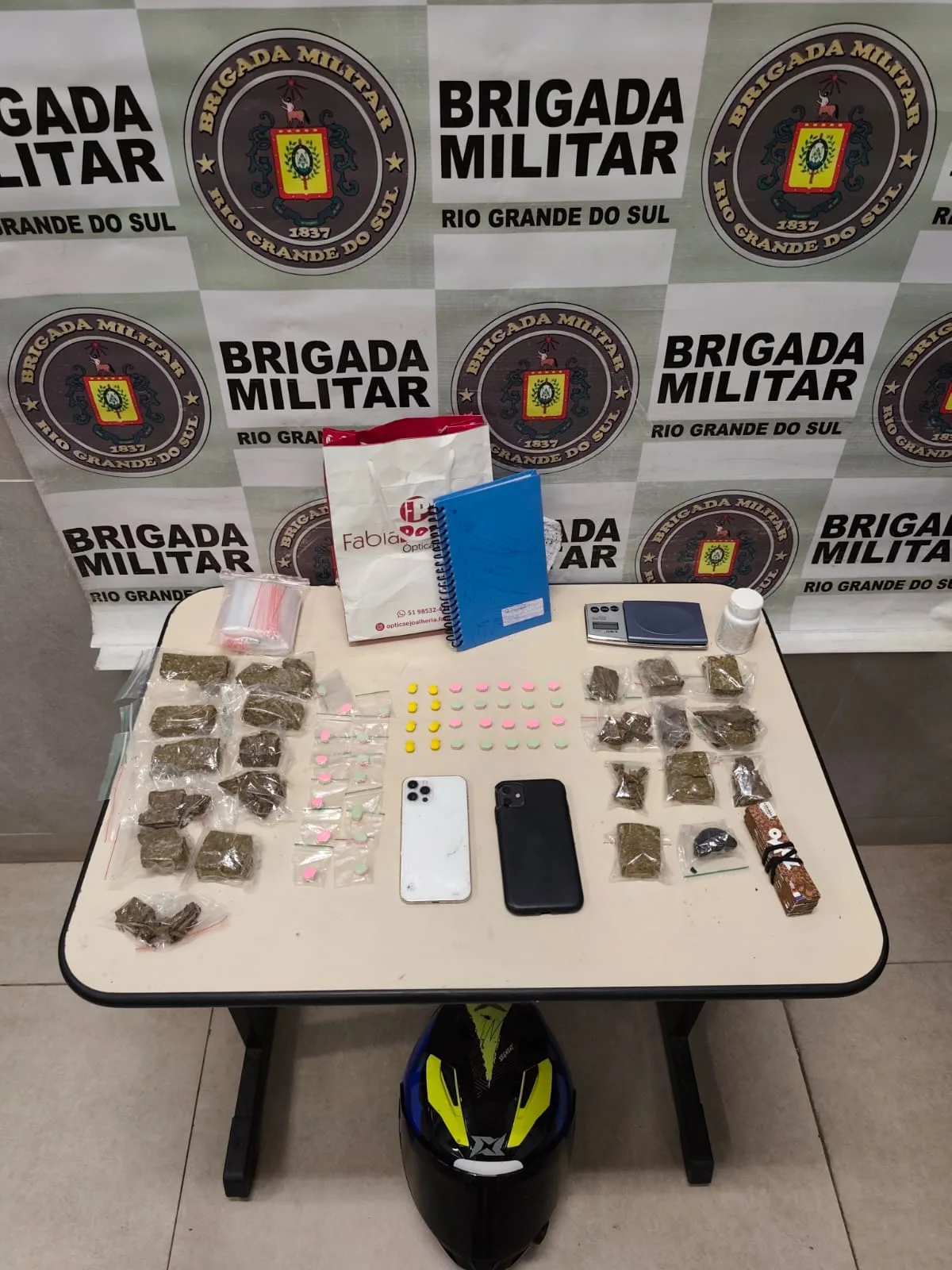 Com a dupla, os policiais encontraram 21 porções de maconha, uma porção de haxixe e 43 porções de ecstasy, além de uma balança de precisão, dois celulares, papel seda e embalagens tipo zip lock. A motocicleta Honda Biz também foi apreendida.