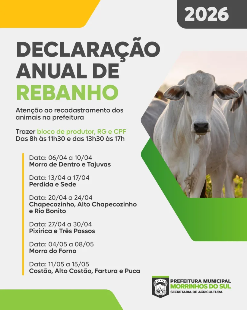 A Prefeitura de Morrinhos do Sul, por meio da Secretaria Municipal de Agricultura, inicia no dia 6 de abril o cronograma da Declaração Anual de Rebanho. A ação será realizada de forma descentralizada em diversas localidades do município, com atendimento das 8h às 11h30 e das 13h30 às 17h.