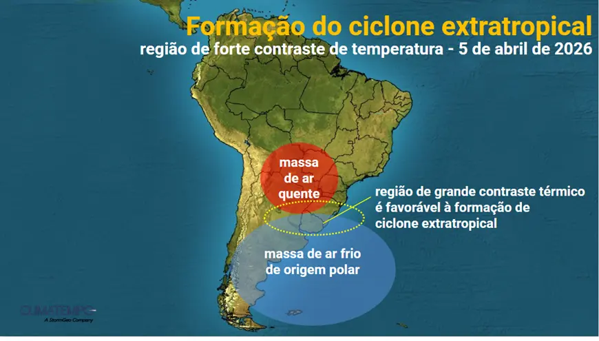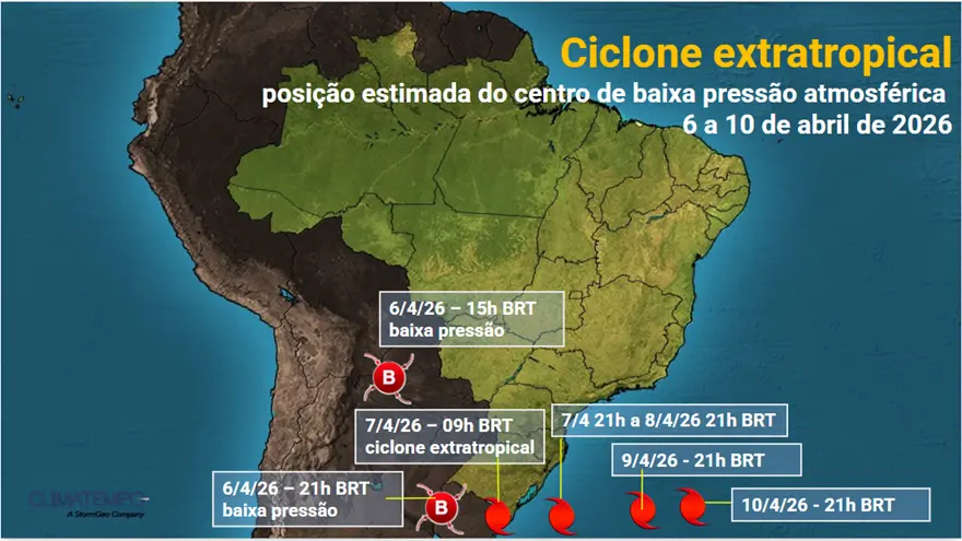A Climatempo alerta que o ciclone extratropical deve se formar entre o Uruguai e o Rio Grande do Sul, devendo passar pelo extremo sul gaúcho no dia 7 de abril, terça-feira, e depois seguir se deslocando pelo oceano, sempre na altura da costa gaúcha.